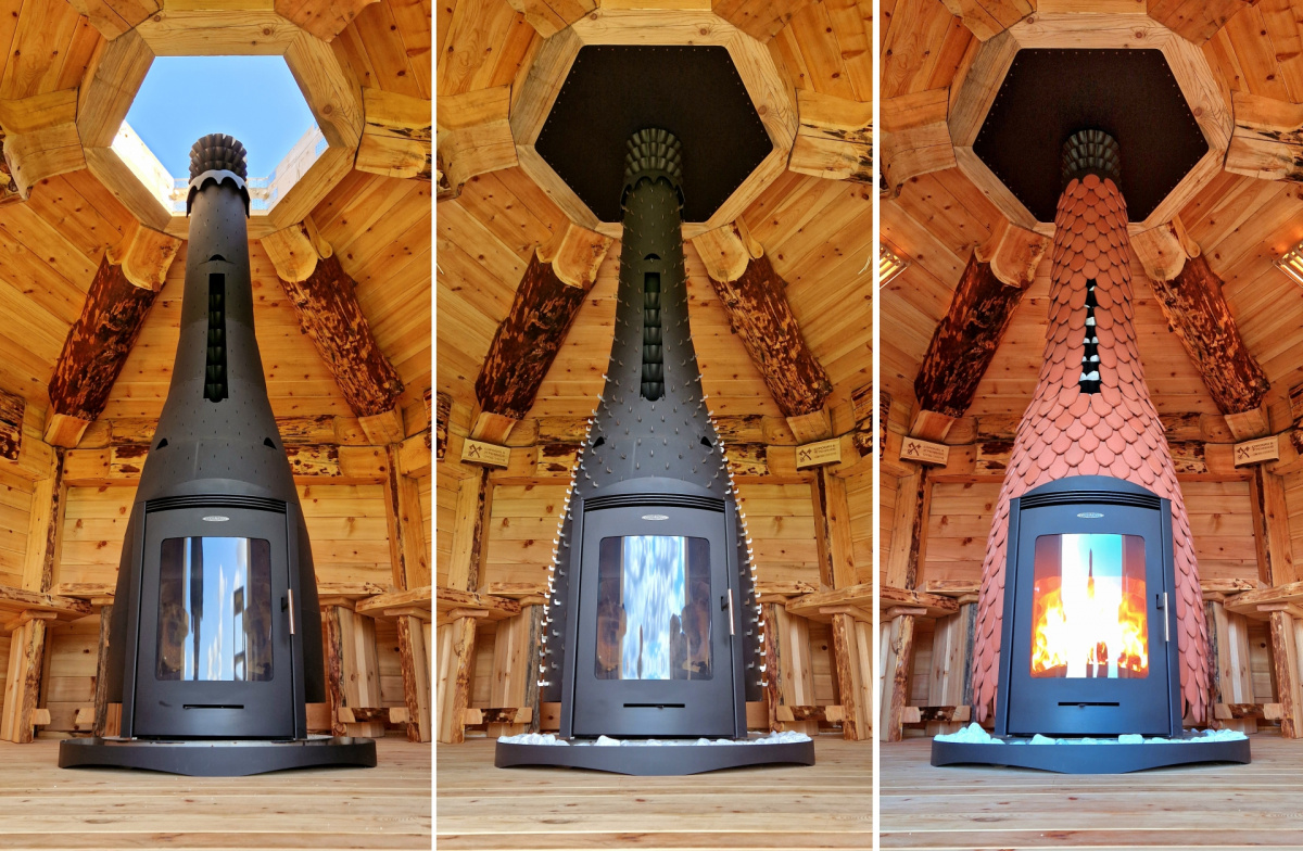 Печь имеет крайне необычную запоминающуюся форму, поскольку объёмы топки и дымохода в ней соединены в одно целое.Бионический дизайн.